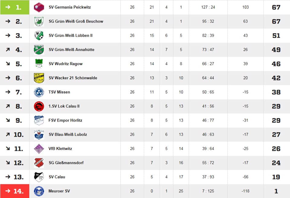 Als Absteiger steht, nicht erst seit gestern, der Meuroer SV mit lediglich einem Zähler aus 26 Partien bereits lange fest. Den Jungs aus Meuro wünschen wir alles Gute und maximale Erfolge in der 1. Kreisklasse.